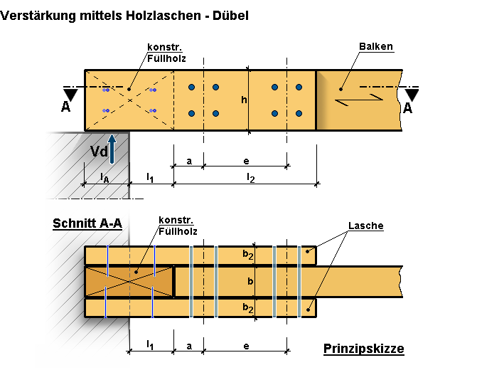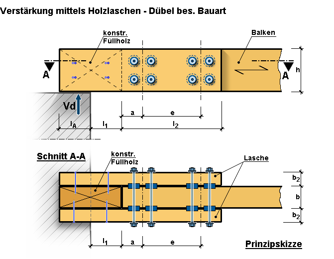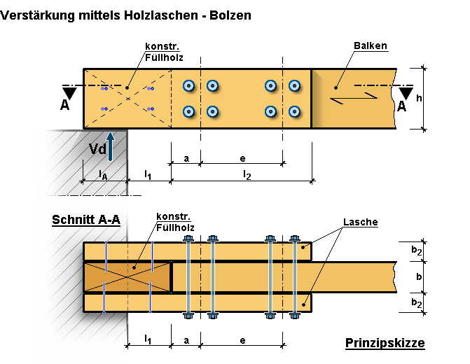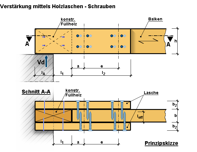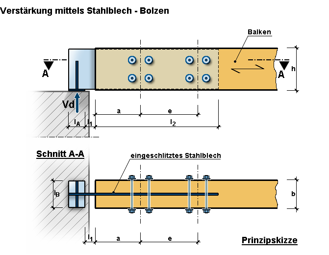 Die Verstärkung erfolgt über Laschen, die seitlich am Balken befestigt und mit verschiedensten Verbindungsmitteln versehen werden können. Alternativ kann die Verstärkung über ein eingeschlitztes Stahlblech erfolgen:
