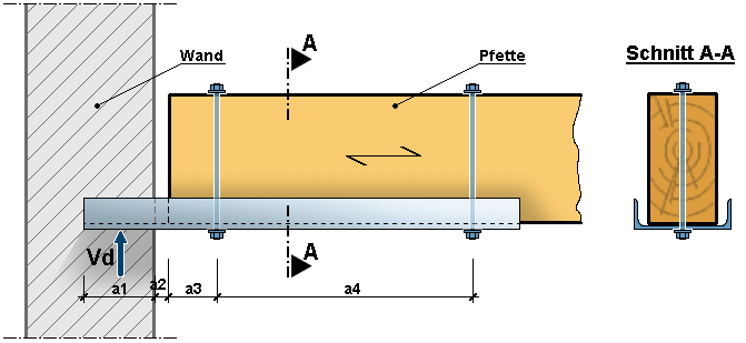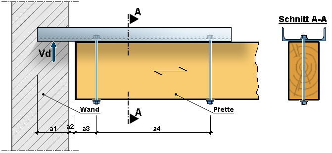 Die Auflagerung der Pfette (oder allgemein des Holzes) wird über ein U-Profil in die Wand geführt. Das Holz kann auf das U-Profil aufgelegt oder, wenn konstruktiv erforderlich, angehängt werden:
