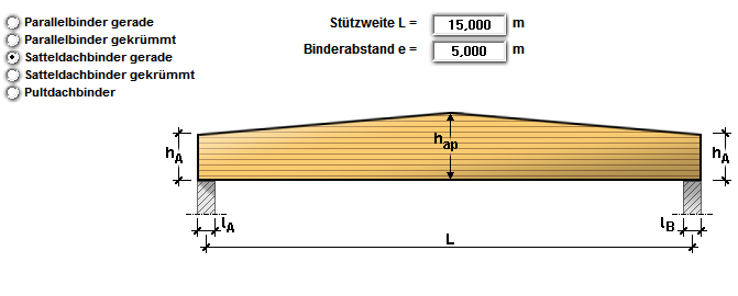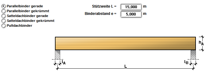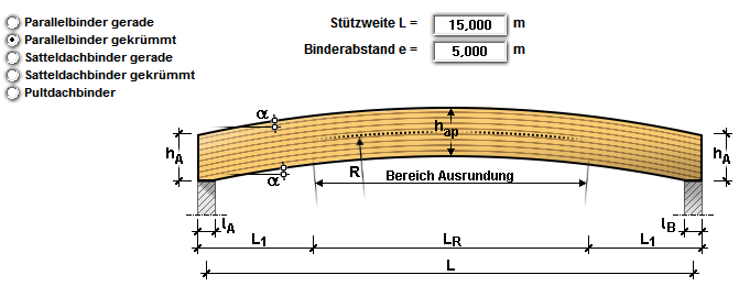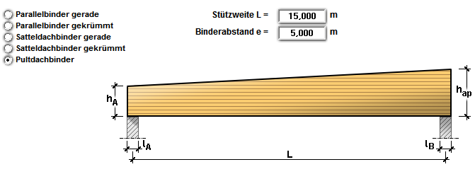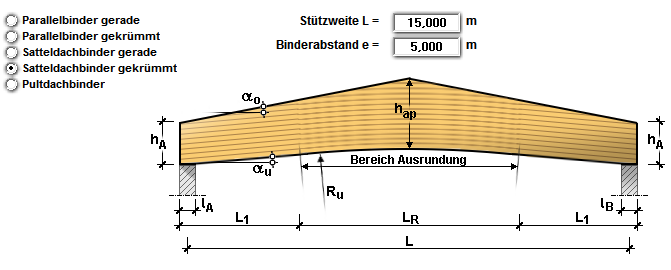 Mit dem Programm Brettschichtholzbinder (BSH-Binder) sind Sie in der Lage, die verschiedensten Formen von Bindern und Dachbindern nachzuweisen. Es werden Einfeldsysteme, ohne Kragarm berücksichtigt. Das Programm wurde nach Einführung der Eurocodes entwickelt und liegt somit nicht zusätzlich nach alter Norm vor.