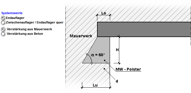 • beim Betonpolster kann zwischen 45° und 60° Lastausbreitung gewählt werden