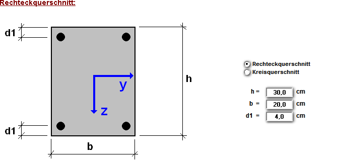 Es wird die erforderliche Bewehrung (auch Mindestbewehrung) ermittelt. Treten nur Druckkräfte auf, die der Beton selbst aufnehmen kann, ist keine Bewehrungswahl vorgesehen. In allen anderen Fällen kann die Bewehrung wie folgt gewählt werden: