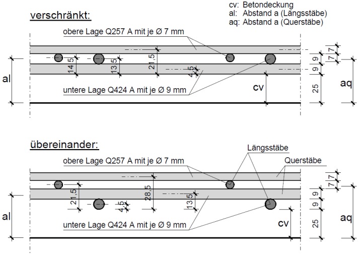 Der Abstand a stellt den Achsabstand der Bewehrung zum Plattenrand dar. Dieser kann vom Anwender vorgegeben werden oder über die Vorgabe der Betondeckung und der Wahl von Matten vom Programm ermittelt werden. Bei der Mattenwahl kann unterschieden werden, ob einlagig oder zweilagig verlegt wird. Bei zweilagiger Mattenbewehrung können die Matten übereinender liegen oder verschränkt verlegt werden. Hier jeweils ein Beispiel, wie das Programm bei 2 Mattenlagen den Abstand a ermittelt: