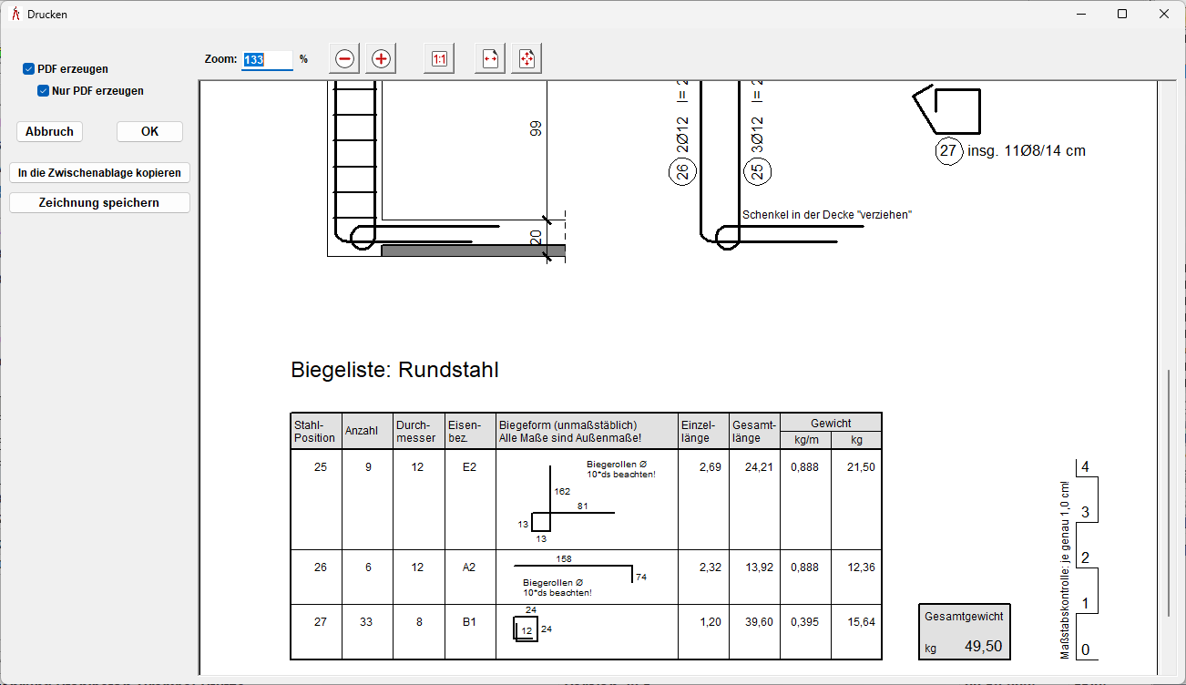 Die Ausgabe erfolgt als Bewehrungsplan mit definierten Maßstäben für Ansicht und Schnitt. Ergänzend wird eine vollständige Biegeliste erzeugt. Diese enthält Positionsnummern, Anzahl, Durchmesser, Biegeformen, Einzellängen, Gesamtlängen sowie Gewichte der Bewehrung. Im Plan werden die verwendete Betongüte sowie die Stahlgüte angegeben. Die Betondeckung wird ausgewiesen und in der Darstellung berücksichtigt.