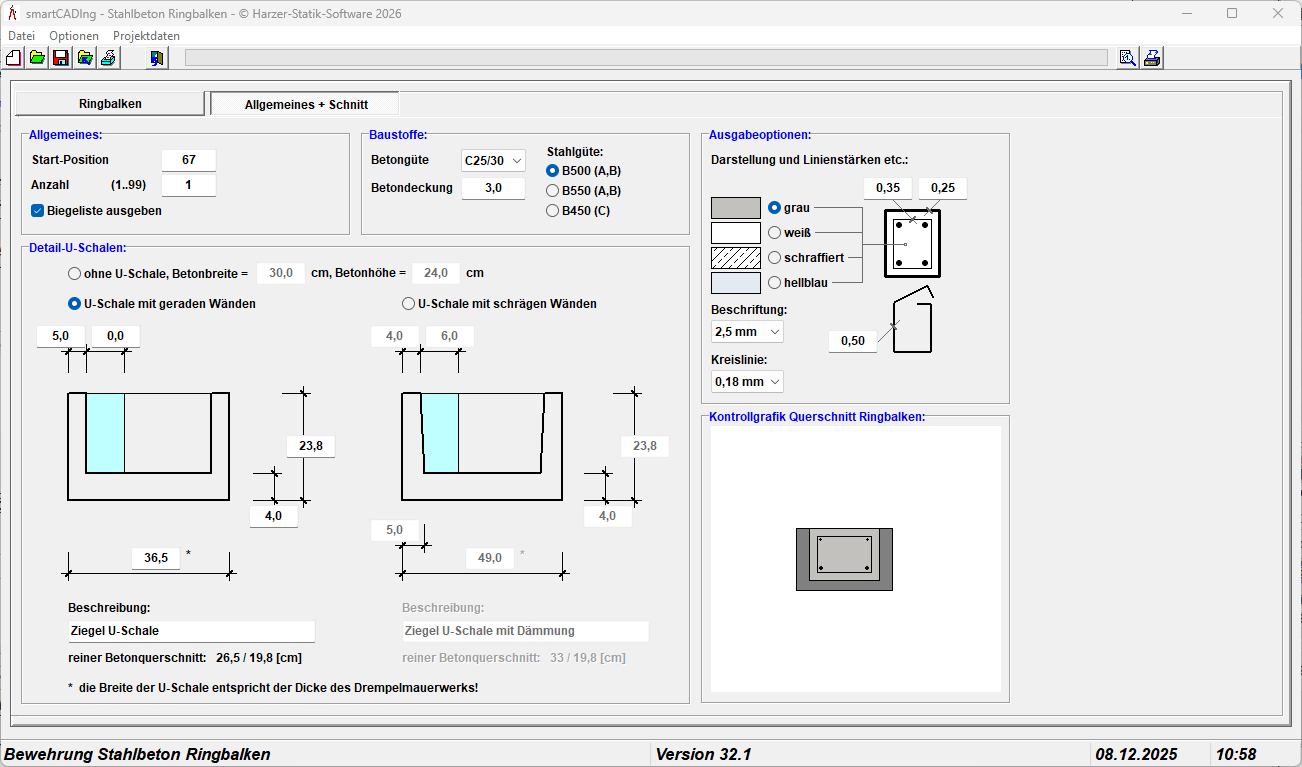 Der Ringanker kann wahlweise ohne U-Schale oder innerhalb einer U-Schale ausgeführt werden. Es stehen als U-Schalen-Varianten mit geraden oder schrägen Wandungen sowie mit optionaler Dämmung zur Verfügung. Die Abmessungen des reinen Betonquerschnitts werden automatisch ermittelt und im Plan ausgewiesen.
