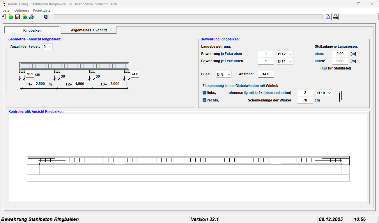 Für den Ringanker können die Längsbewehrung oben und unten sowie die Bügelbewehrung vorgegeben werden. Optional lassen sich Einspannungen in Giebelwänden berücksichtigen, beispielsweise durch winkelförmig abgebogene Längseisen mit definierter Schenkellänge.