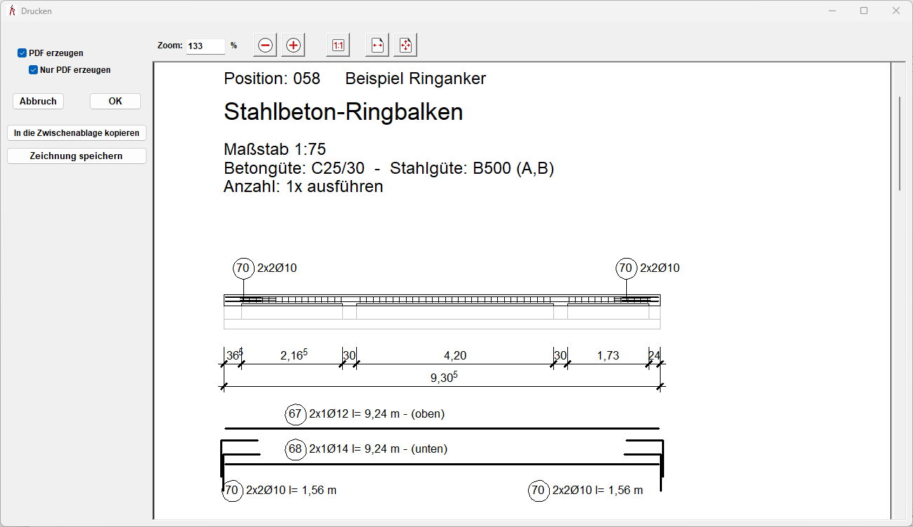 Die Ausgabe erfolgt als Bewehrungsplan mit definierten Maßstäben für Ansicht und Schnitt. Ergänzend wird eine Biegeliste erzeugt, in der alle Bewehrungspositionen mit Durchmesser, Biegeform, Einzellängen, Anzahl, Gesamtlängen und Gewichten aufgeführt sind.
