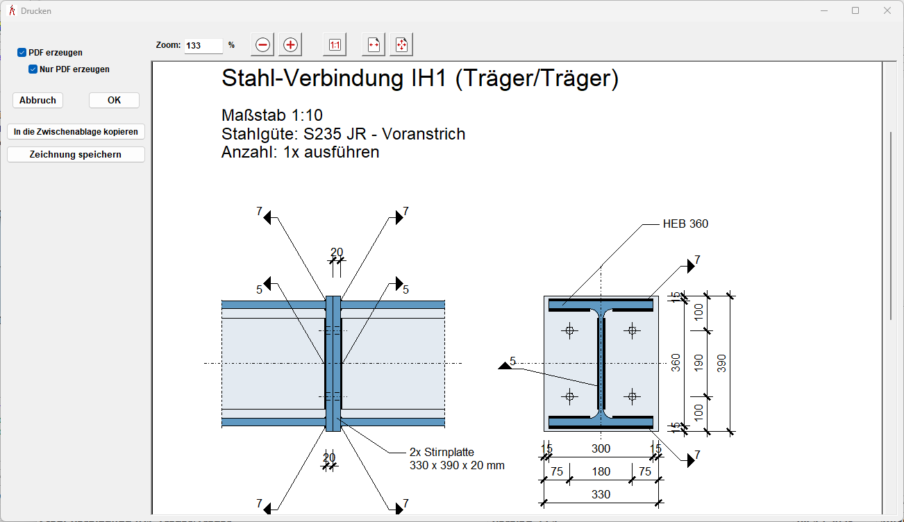 Es können unterschiedliche Trägerprofile, Stirnplattengeometrien, Schraubenanordnungen sowie Schweißnähte definiert werden. Die Darstellung umfasst sowohl die Ansicht als auch den Querschnitt desAnschlusses und zeigt die maßgebenden Abstände, Schraubenlagen und Bauteildimensionen.