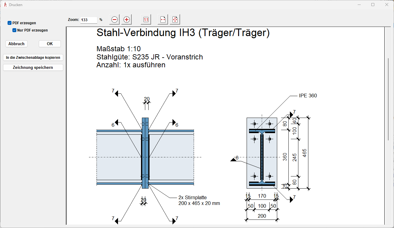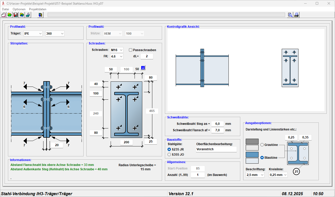 Es können unterschiedliche Trägerprofile, Stirnplattengeometrien, Schraubenanordnungen sowie Schweißnähte definiert werden. Die Darstellung umfasst sowohl die Ansicht als auch den Querschnitt desAnschlusses und zeigt die maßgebenden Abstände, Schraubenlagen und Bauteildimensionen.