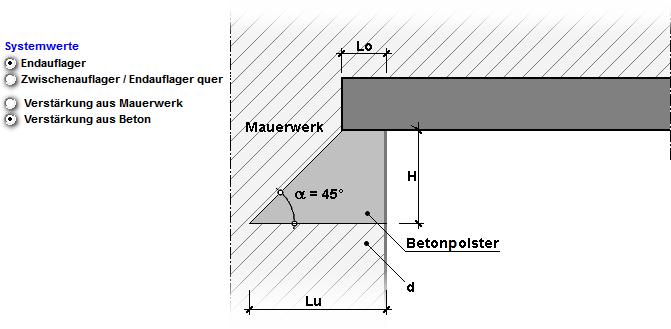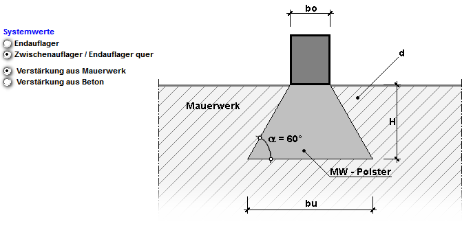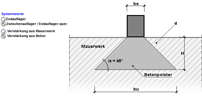 • beim Betonpolster kann zwischen 45° und 60° Lastausbreitung gewählt werden