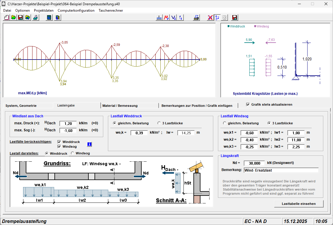 Für die Windbeanspruchung der Drempel können unterschiedliche Lastansätze gewählt werden. Neben einer gleichmäßig verteilten Belastung besteht die Möglichkeit, bis zu drei unterschiedliche Lastblöcke zu definieren. Dadurch lassen sich auch abschnittsweise variierende Windbeanspruchungen der Drempel praxisgerecht abbilden.