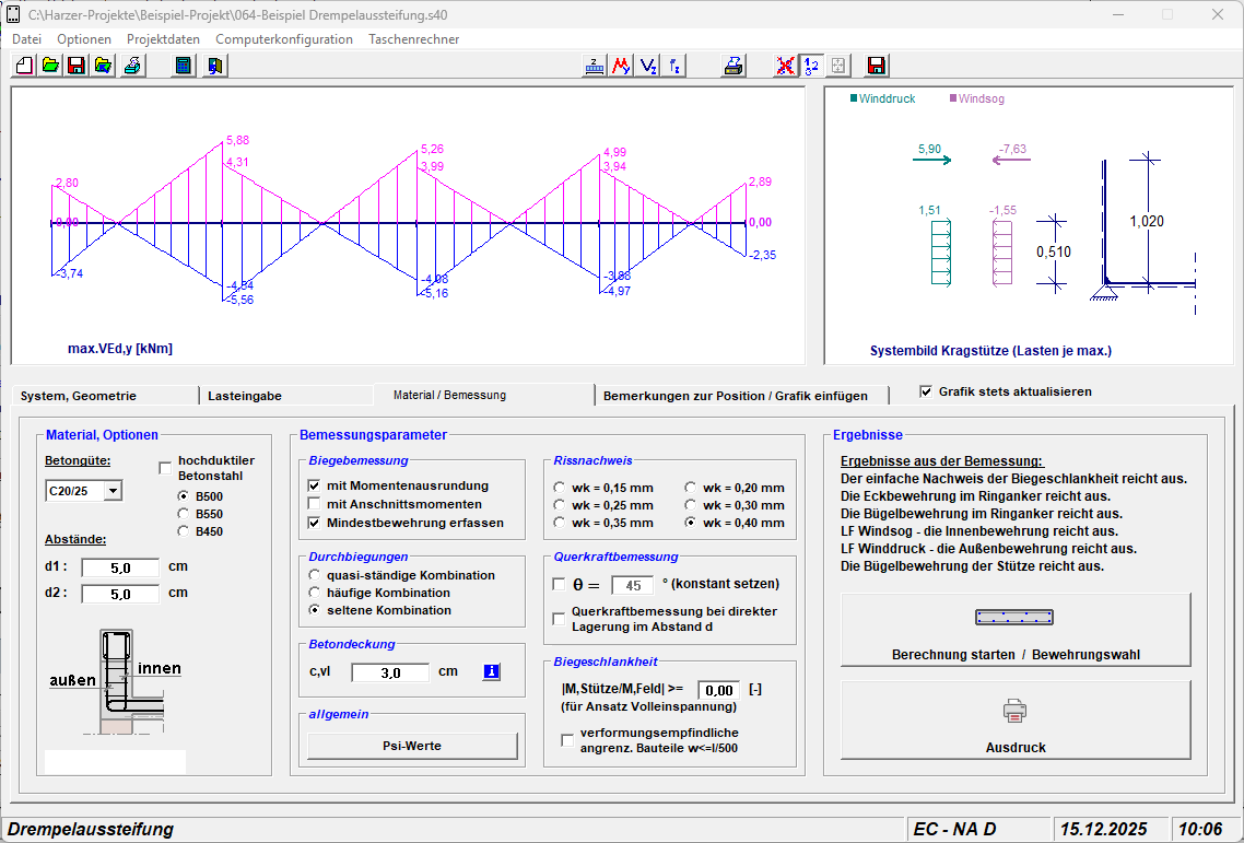 Das Programm stellt das System, die Lastannahmen sowie die resultierenden Schnittgrößen übersichtlich grafisch dar. Für Ringanker und Drempelstützen werden Momenten- und Querkraftverläufe ausgegeben, ergänzt durch strukturierte Ergebnistabellen. Die Bewehrungsauswahl kann interaktiv erfolgen und unmittelbar in die Berechnung übernommen werden.