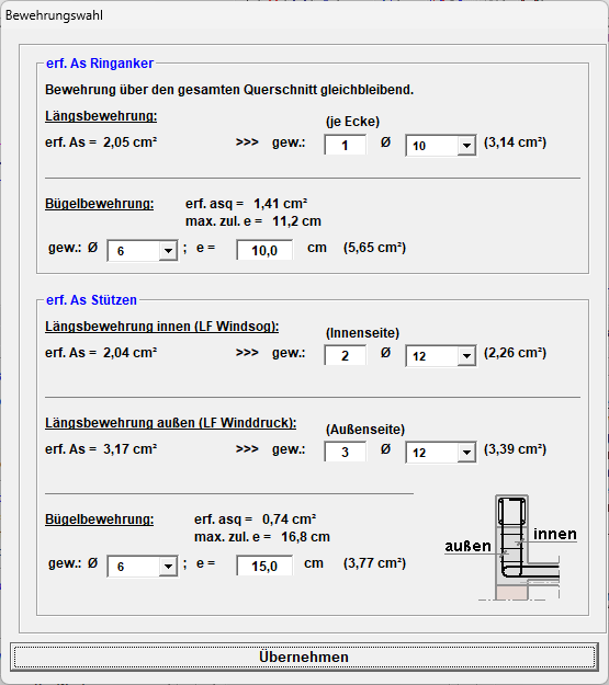 Für den Ringanker wird die Bewehrung über den gesamten Querschnitt einheitlich angesetzt. Die erforderliche Längsbewehrung wird je Ecke ermittelt, ebenso die notwendige Bügelbewehrung einschließlich der maximal zulässigen Bügelabstände. Die gewählte Bewehrung wird unmittelbar mit den erforderlichen Werten verglichen und in den Nachweisen berücksichtigt.