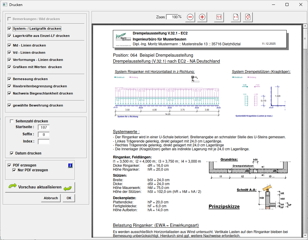 Das Programm Drempelaussteifung dient dem Nachweis der horizontalen Aussteifung von Drempelwänden bei klassischen Pfettendächern. Grundlage ist ein System aus Ringanker und Drempelstützen, wobei der Ringanker als durchlaufender Träger und die Drempelstützen als Kragträger modelliert werden. Die Bemessung erfolgt nach Eurocode 2 in Verbindung mit dem Nationalen Anhang Deutschland.