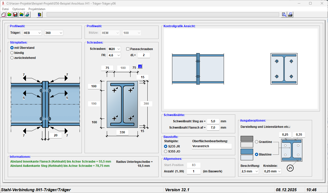 10. Stahlbau - IH3 - Träger / TrägerKurzinfo: Die Variante Stahlbau Anschluss - IH3 - Träger / Träger erstellt die erforderlichen Ausführungszeichnungen zum gleichnamigen Statik-Modul für einen momentenbeanspruchten Träger-Träger-Anschluss mit Stirnplatte. Die Ausführungszeichnung kann nach smartCADIng importiert und dort weiterbearbeitet und ergänzt werden. --> klick auf das Vorschaubild > zur Programmbeschreibung < |
