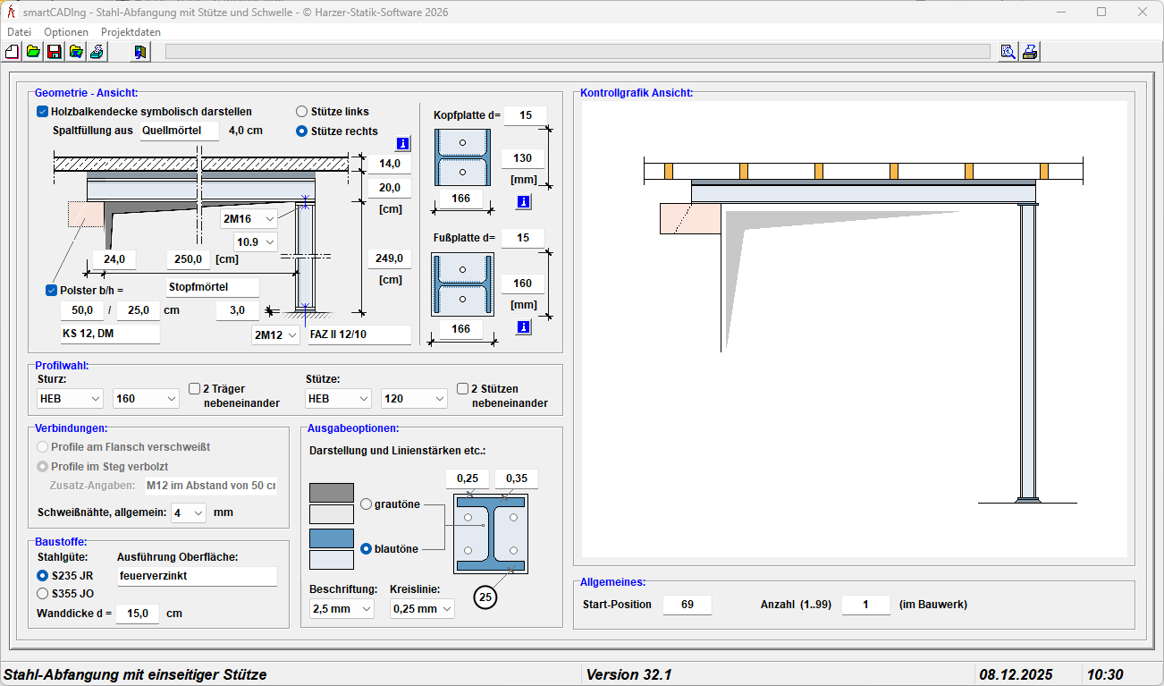 7. Stahlabfangung mit nur einer StützeKurzinfo: Die Variante „Stahlabfangung mit einer Stütze“ schließt die Lücke zwischen den Programmen „Stahlabfangung“ und „Stahlabfangung mit Stützen“. Sie kommt zum Einsatz, wenn bei einem Wanddurchbruch die Lagerung des Sturzes auf dem Mauerwerk nur an einem Auflager nicht ausreicht und dort eine zusätzliche Stahlstütze erforderlich wird. --> klick auf das Vorschaubild > zur Programmbeschreibung < |