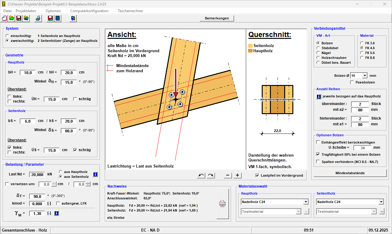 2. Gesamtanschluss - HolzKurzinfo: Das Programm Gesamtanschluss – Holz ermöglicht den Nachweis von Holzverbindungen mit zwei oder drei Hälzern unter beliebigen Winkeln nach Eurocode 5 und NA Deutschland. Dabei werden sowohl ein- als auch zweischnittige Anschlüsse abgedeckt, einschließlich der erforderlichen Mindestabstände, der Last- und Kraft-Faser-Winkel sowie der Bemessung der Verbindungsmittel. --> klick auf das Vorschaubild > zur Programmbeschreibung < |