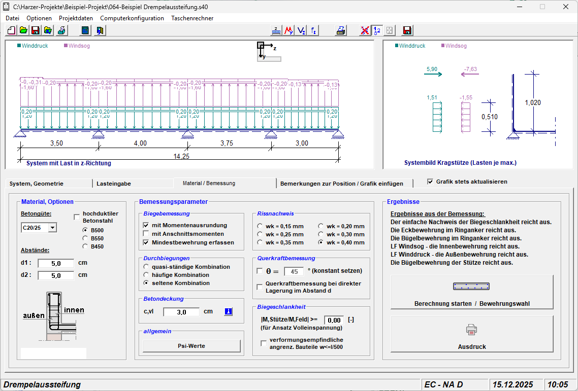 1. DrempelaussteifungKurzinfo: Das Programm Drempelaussteifung ermöglicht den Nachweis von Drempel- und Aussteifungsstützen mit Ringanker in klassischen Pfettendächern nach Eurocode 2 und NA Deutschland. Die Windlasten werden vollständig erfasst, der Ringanker bemessen und die Drempelstützen als Kragträger nachgewiesen, sodass die horizontale Aussteifung des Dachbereichs zuverlässig beurteilt werden kann. --> klick auf das Vorschaubild > zur Programmbeschreibung < |