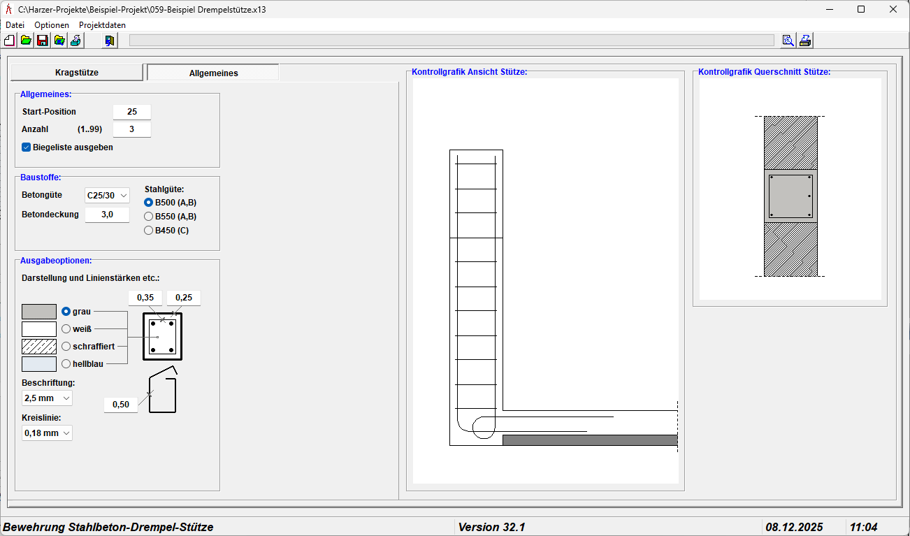 Die Drempelstütze wird als Stahlbetonstütze mit rechtwinkligem Querschnitt dargestellt. Höhe, Breite und Tiefe der Stütze können vorgegeben werden. Die Stütze wird in der Ansicht sowie im Grundriss dargestellt; zusätzlich wird ein Querschnitt ausgegeben, in dem der konstruktive Aufbau und die Bewehrung eindeutig erkennbar sind.