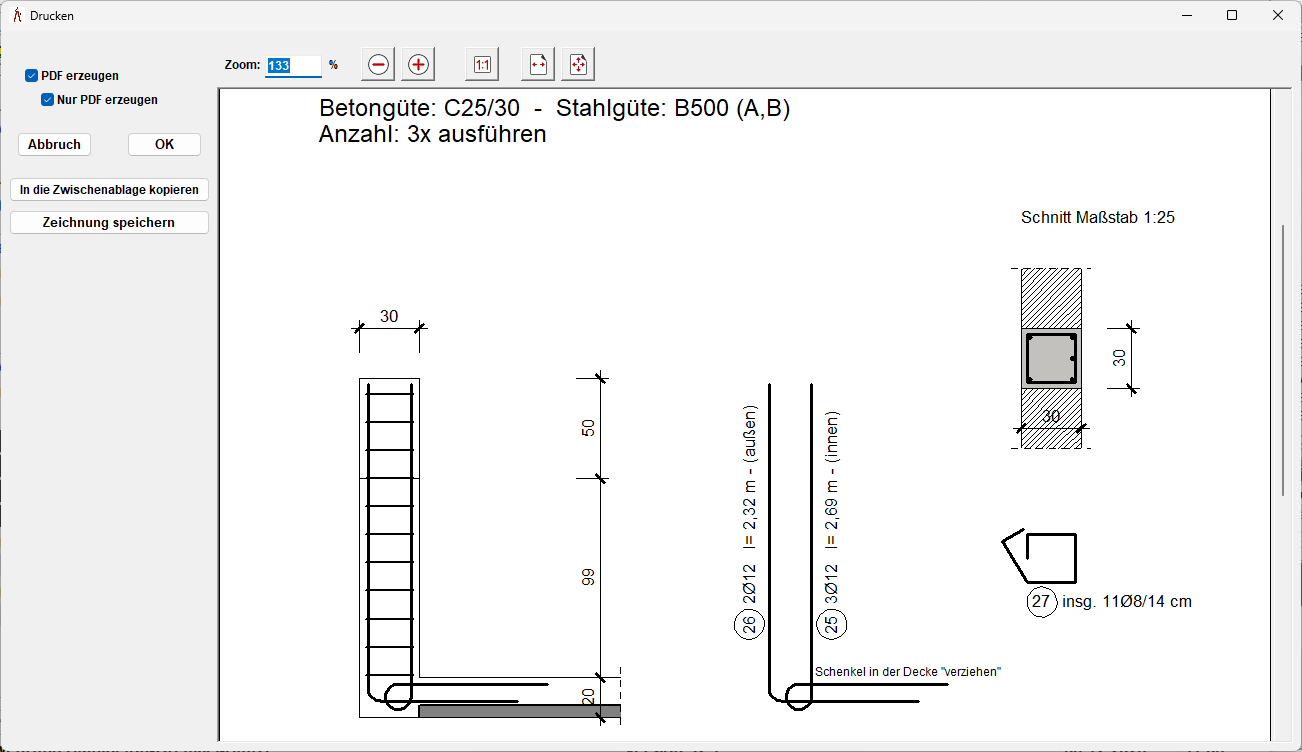 Die Ausgabe erfolgt als Bewehrungsplan mit definierten Maßstäben für Ansicht und Schnitt. Ergänzend wird eine vollständige Biegeliste erzeugt. Diese enthält Positionsnummern, Anzahl, Durchmesser, Biegeformen, Einzellängen, Gesamtlängen sowie Gewichte der Bewehrung. Im Plan werden die verwendete Betongüte sowie die Stahlgüte angegeben. Die Betondeckung wird ausgewiesen und in der Darstellung berücksichtigt.